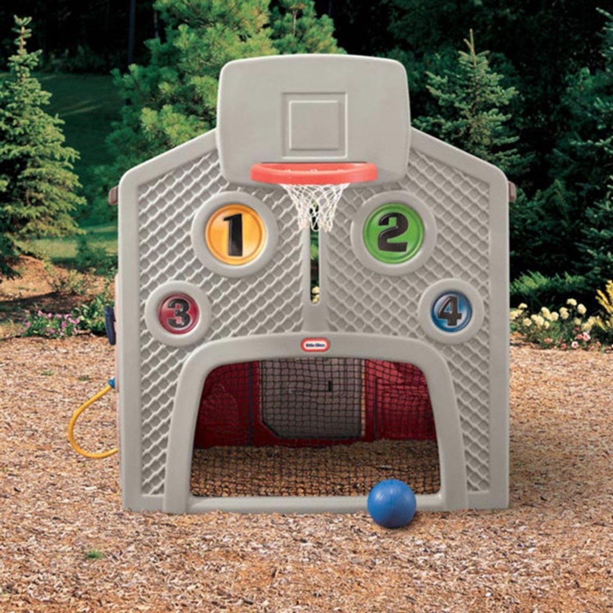 Een sportieve wand met een bal, een basket, een voetbal/hockey net, en mikpunten